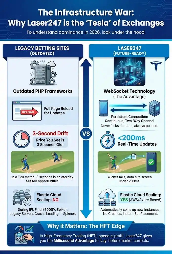 To understand why Laser247 dominates the 2026 market, you must look under the hood. Most legacy betting sites operate on outdated PHP frameworks that require a full page reload to update odds. This causes “Drift”—where the price you see is 3 seconds old. In a T20 match, 3 seconds is an eternity.