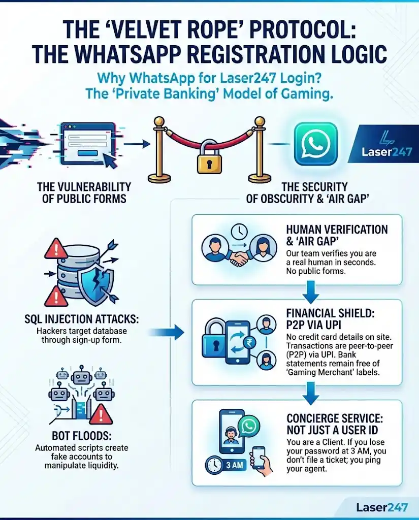 By moving registration to WhatsApp, Laser247 creates an “Air Gap.”