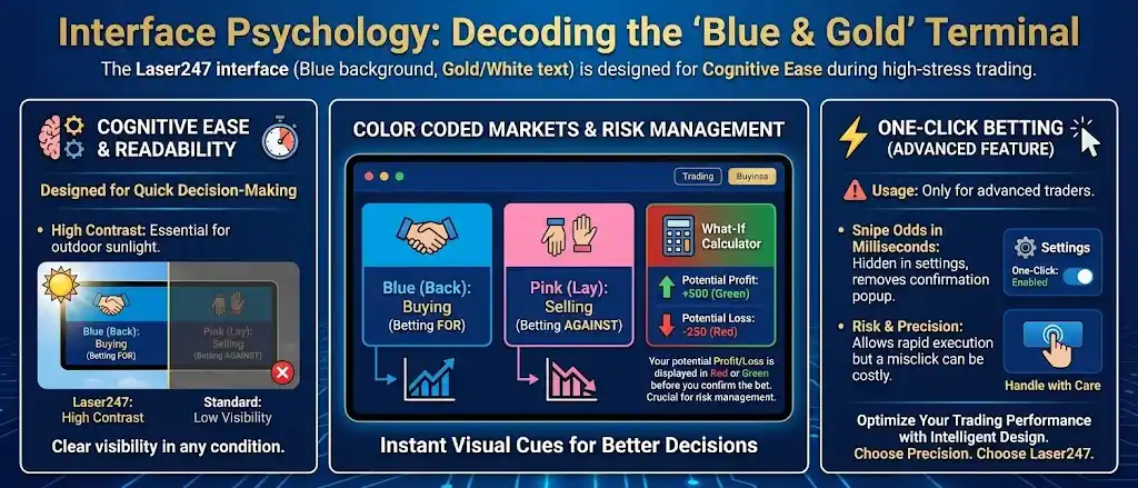 The Laser247 interface (Blue background, Gold/White text) is not just an aesthetic choice. It is designed for Cognitive Ease during high-stress trading.