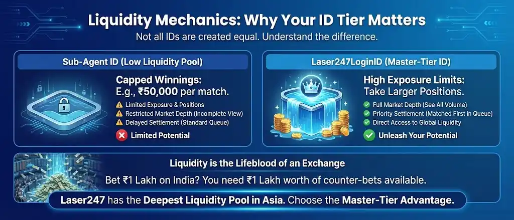 When you get a Laser247 ID from a sub-agent, you are often put in a “Low Liquidity Pool.” This means you might be capped at winning ₹50,000 per match.