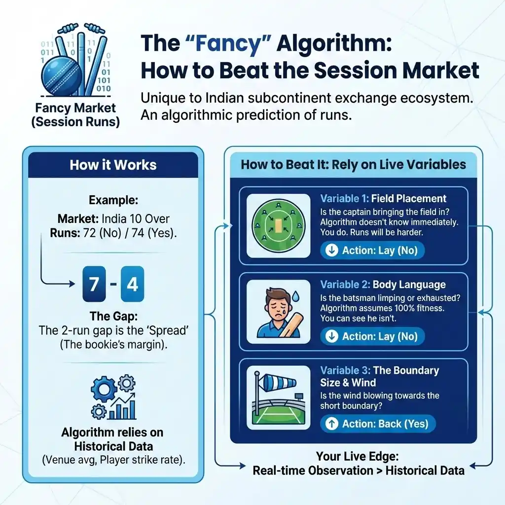 The “Fancy” market (Session Runs) is unique to the Indian subcontinent exchange ecosystem. It is an algorithmic prediction of runs.
