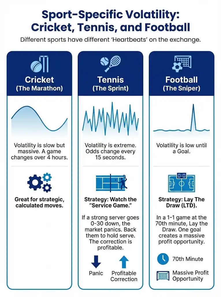 - Cricket (The Marathon): Volatility is slow but massive. A game changes over 4 hours. Great for strategic, calculated moves.