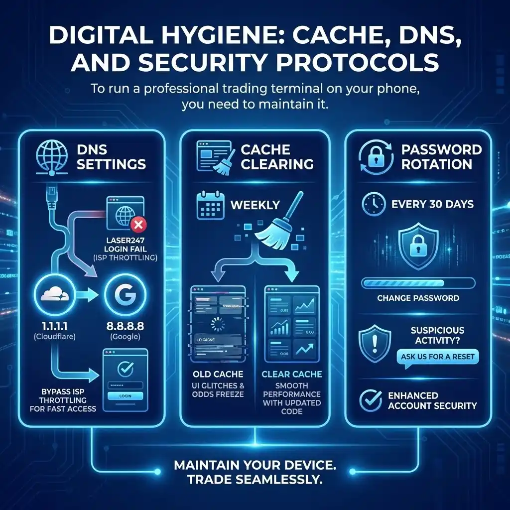 - Cache Clearing: Clear your browser cache weekly. The Laser247 platform updates its code frequently. Old cache files can cause “UI Glitches” where the odds freeze.